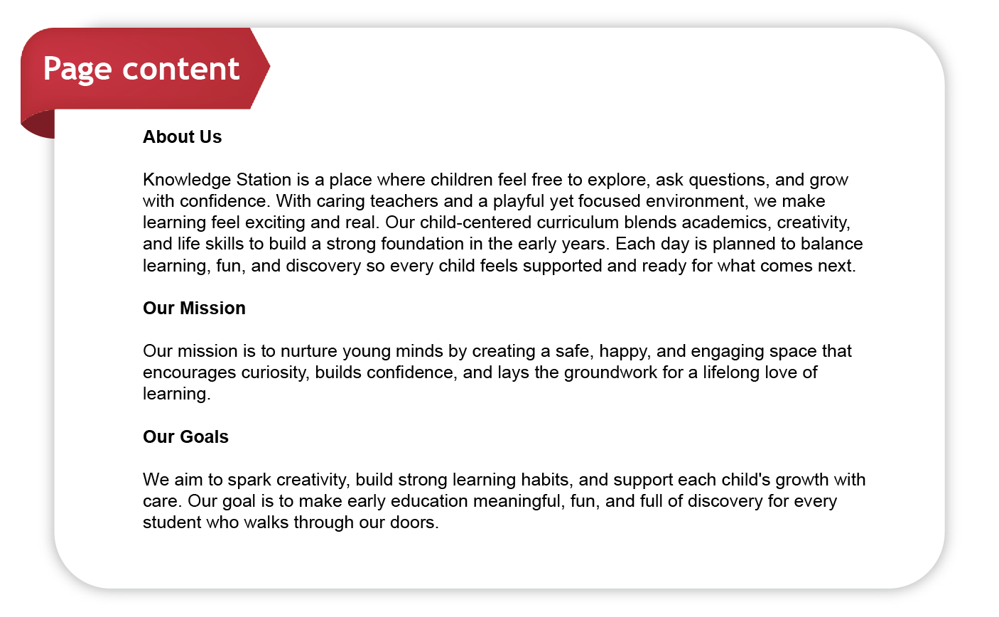 To share authentic feedback from parents, building credibility and trust. Positive testimonials help new visitors feel confident about choosing Knowledge Station for their children.