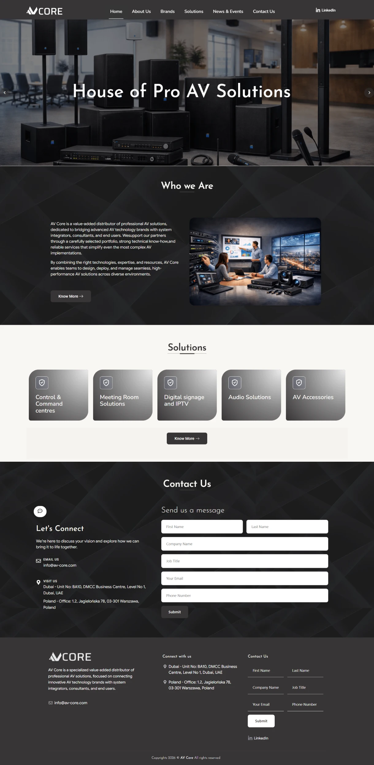 https://av-core.com/ is a professionally designed, multi-page website for AV Core, crafted to present the brand with clarity and confidence. The site features a clean, modern layout that allows users to smoothly navigate through sections such as Home, About Us, Solutions, Brands, and Contact Us. The design maintains a strong visual balance, making content easy to understand while keeping the experience engaging. Clear call-to-actions, integrated enquiry forms, and interactive elements make user interaction simple and effective. Overall, the website delivers a polished and user-friendly digital experience that reflects AV Core’s expertise and strong presence in the AV solutions industry.