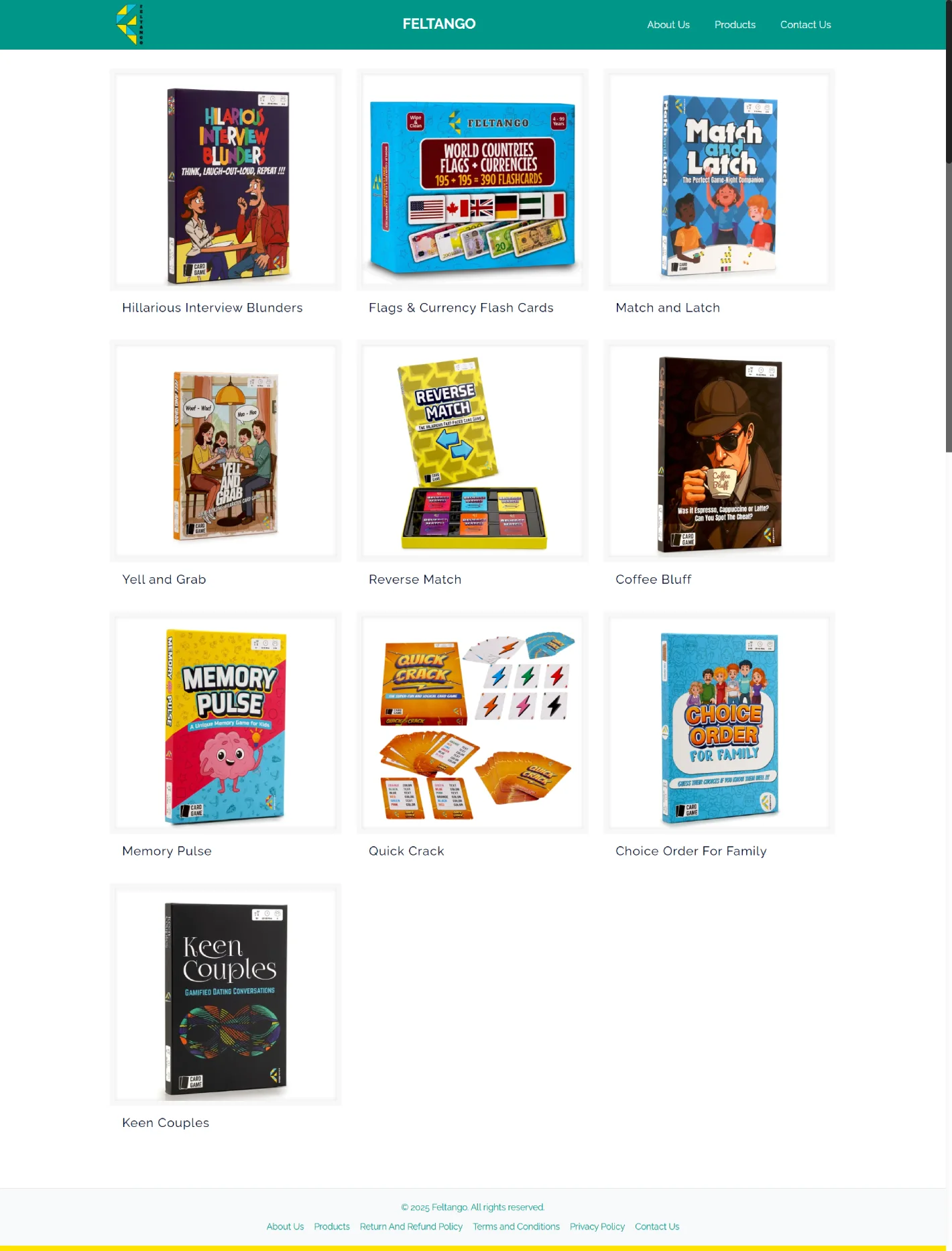 www.feltango.com is a lively and engaging website designed for Feltango, a brand that brings families, friends, and game enthusiasts together with fun and smart card and board games. The site features a vibrant and intuitive layout, making it easy for visitors to explore games and view details. Each game includes an embedded YouTube video with instructions, helping users learn how to play quickly and easily. Purchases are made convenient through a secure checkout that redirects directly to Amazon. A contact form allows users to get in touch easily. The website reflects the playful and energetic spirit of Feltango while providing a seamless browsing and shopping experience.