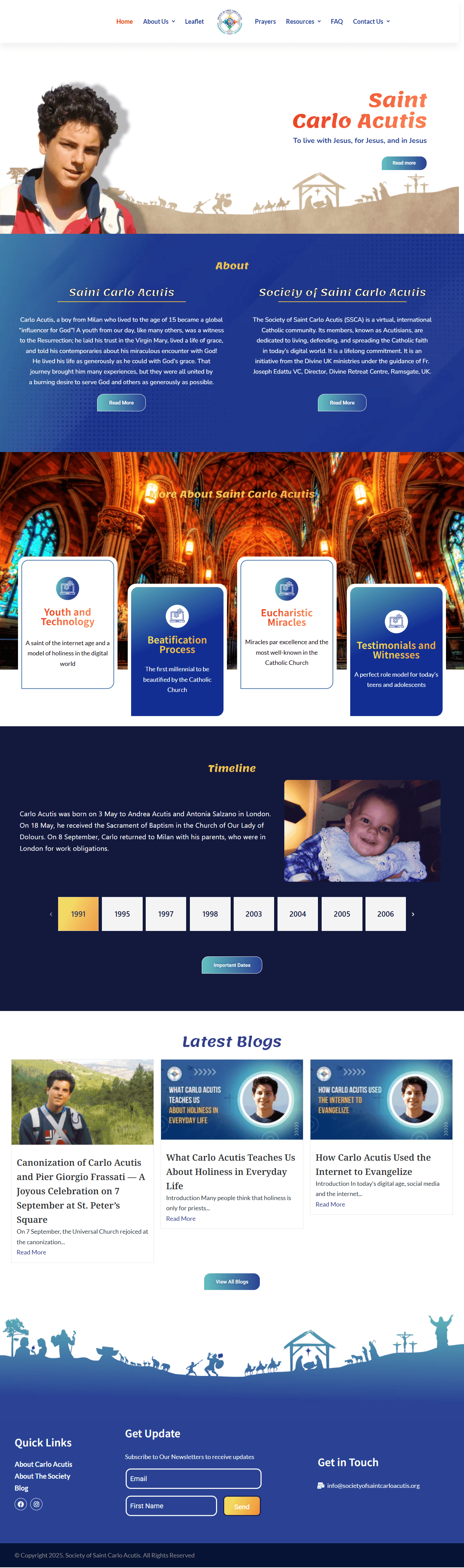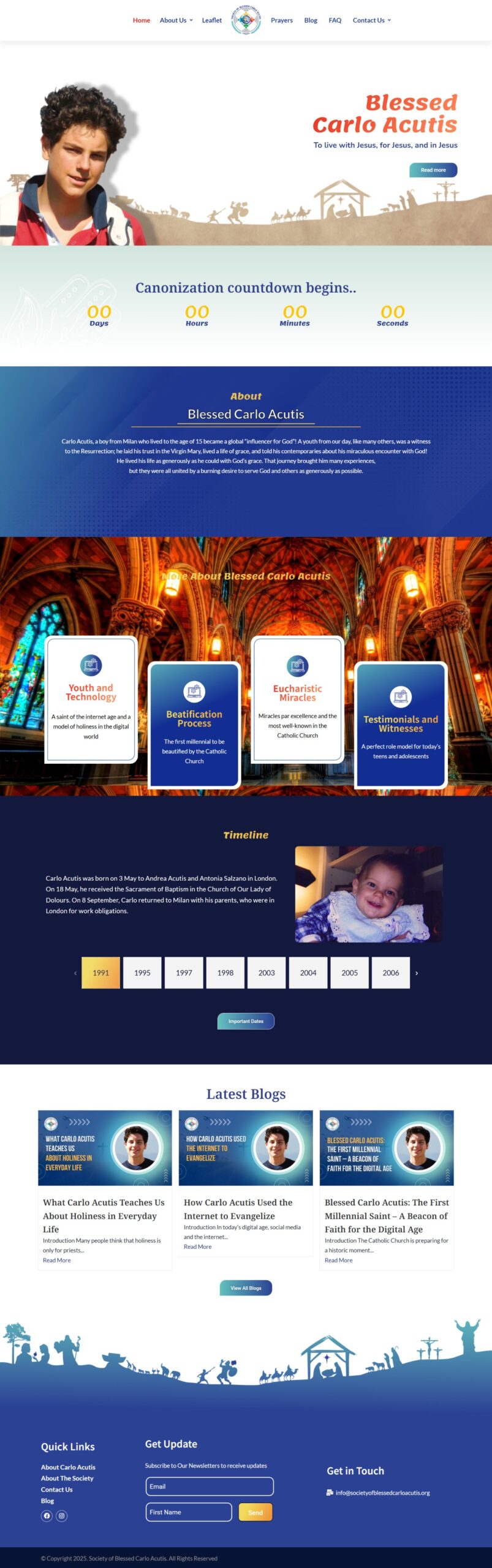 www.societyofblessedcarloacutis.org is a website developed for the Society of Blessed Carlo Acutis. It offers in-depth information about the life, virtues, and canonization journey of Blessed Carlo. Visitors can explore various sections dedicated to his biography, miracles, and spiritual insights. The site allows users to send prayer petitions, submit testimonies, and ask Bible-related questions with ease. Designed to be fully responsive and user-friendly, the website ensures smooth navigation across all devices. It features an intuitive layout, clear menus, and quick-access buttons to help visitors find what they need without hassle. Regular updates, spiritual content, and an engaging interface make it an inviting platform for those who wish to stay connected to the mission and message of Blessed Carlo.