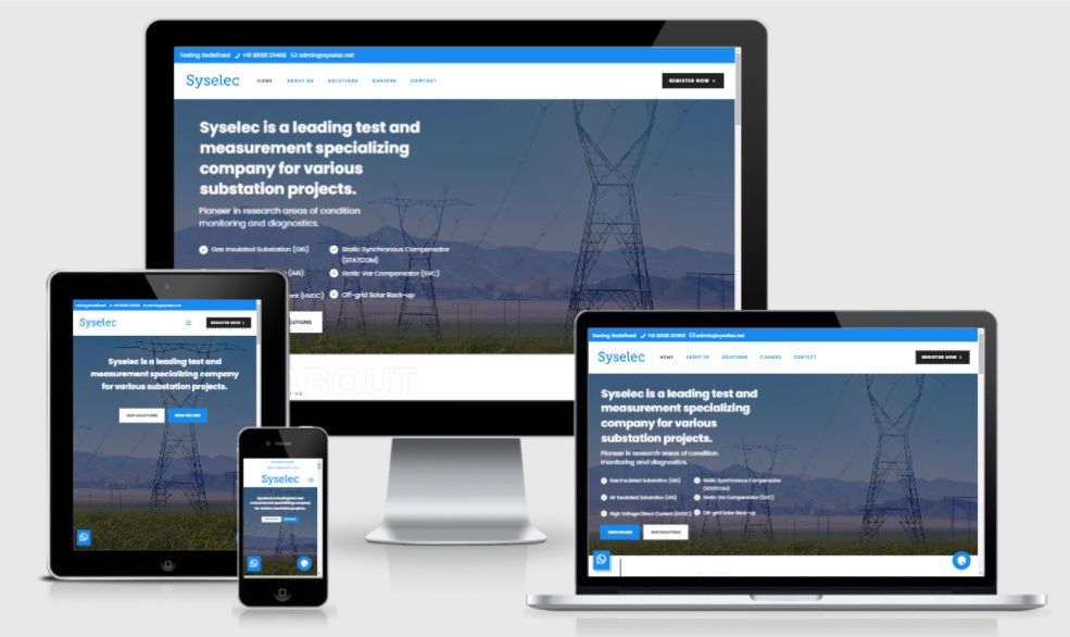 syselectechnologies.in is a website developed for Syselec Technologies, a leading test and measurement specializing company for various substation projects. The website showcases the list of Major Projects executed by Syselec and also the solutions offered by them. The website allows visitors to send a message and for companies to register depending on their areas of interest. The careers page has a form offering various positions that helps candidates join the Syselec team.