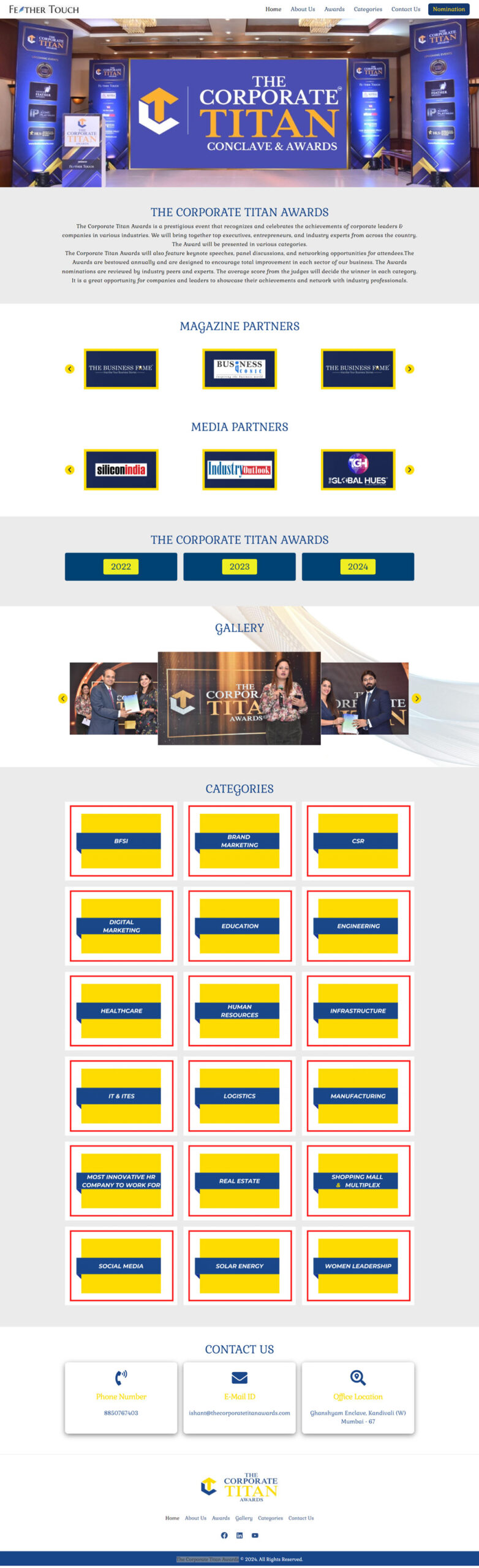www.thecorporatetitanawards.com is a single-page website developed for The Corporate Titan Awards organized by Feather Touch. The website lists all the achievements of corporate leaders & companies in various industries. Information regarding the events held in 2022, 2023, and 2024 is also updated in PDF format. The Gallery Slider shows different images of the event. All contact information is mentioned on the website. Interested candidates can nominate themselves by filling out the Google Form linked to the website.